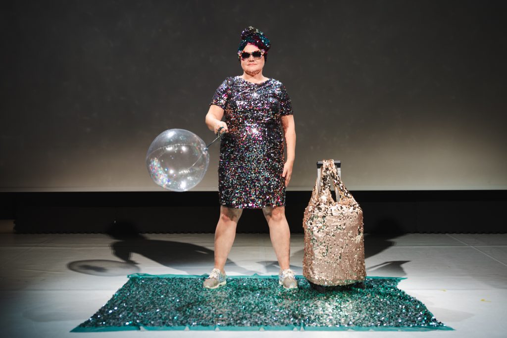 “Blue Gold” is a performative collage composed of fragments from earlier choreographies and several new scenes, creating a personal and patchwork-like portrait of the artist – the main creator behind the universe of the Warsaw-based HOTELOKO Company. Agata Życzkowska’s solo moves along the edge of madness, absurdity, and melancholy, becoming both an intimate and universal search for the identity of a woman-artist who continually transforms her body, movement language, and personal biography. The performance consciously plays with the convention of a “greatest hits” show, but instead of offering a nostalgic return to the past, it presents a bold and energetic remix – filtered through the current life moment and emotional state. It’s a physical journey in which an experienced body still pulses with an irresistible urge to live. The sequins worn by the artist are not just decorations – they are armor, stories, traces of all her previous selves. Their shimmer reflects the light of the past and directs it toward the future.